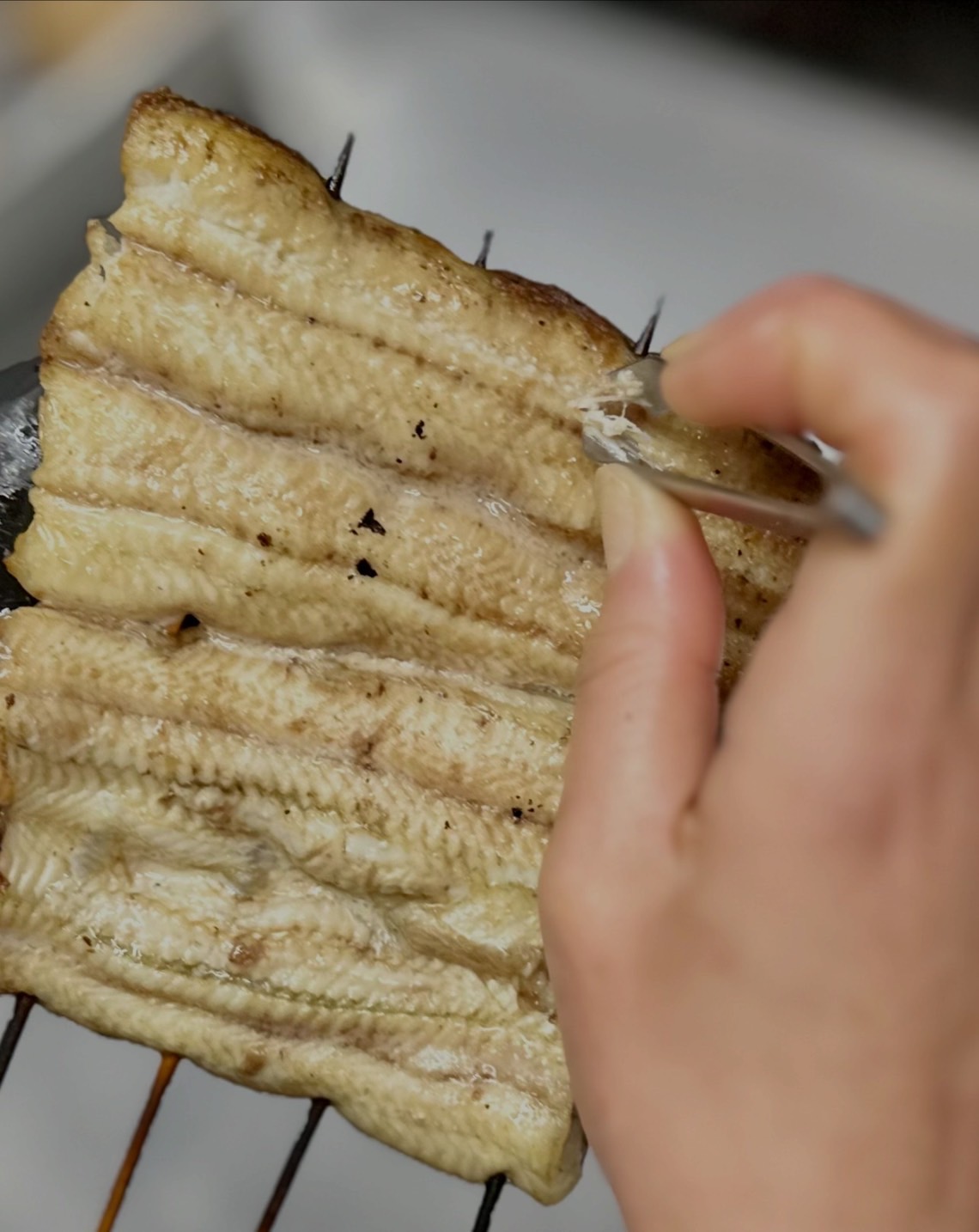松重では、うなぎを割き、串を打ち、素焼きを行い、蒸しへと進みます。さらに数年前からは小骨を一本一本丁寧に抜く工程も取り入れてまいりました。